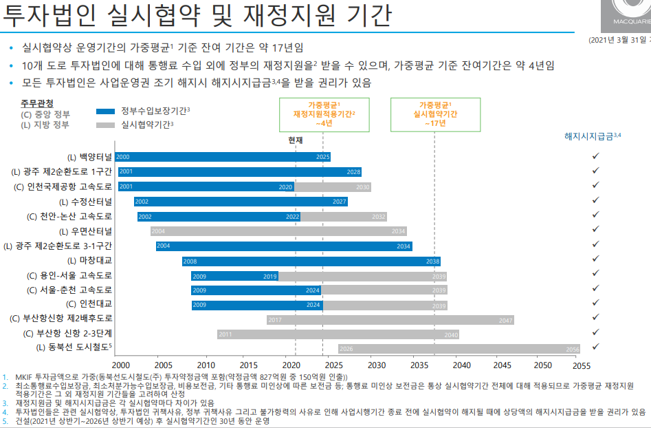 매우 불공정한 계약(?)이라고 볼 수 있는 부분이 손실이 나더라도 세금으로 보상해주는 기간이 수십년이 보장되어 있다. IMF의 여파로 민영화와 외화유치, 외국인 투자를 외치면서 사업권을 제공했는지는 모르겠는데, 맥쿼리 입장에서는 투자만 해 놓으면, "손실은 너네가, 수익은 내가" 이런 꿀같은 사업이 없어보인다.