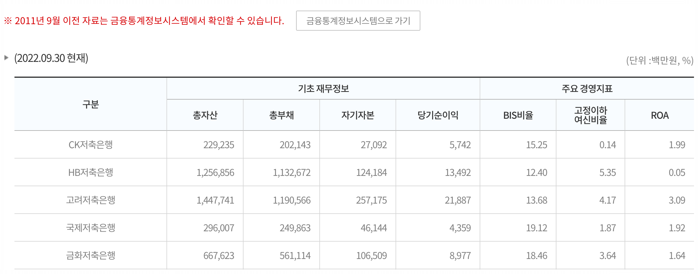 위 링크를 들어가보면, 2022년 9월 30일 기준으로 저축은행들의 재무정보와 경영지표 값을 참조해 볼 수 있다.