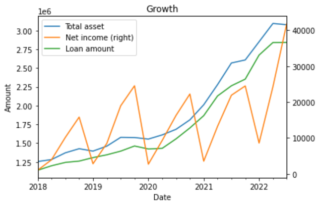 자산과 대출금액이 꾸준히 성장, 최근에 순이익 급증