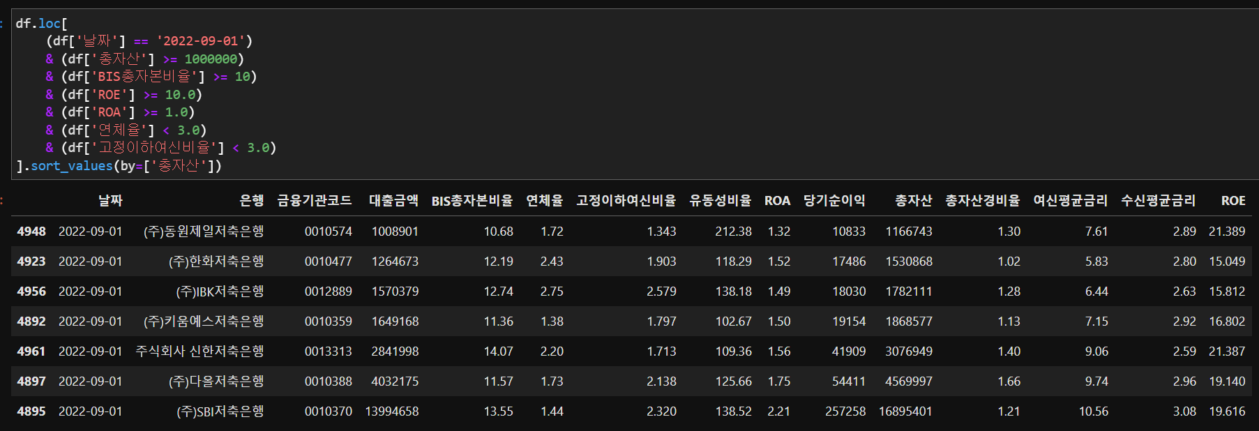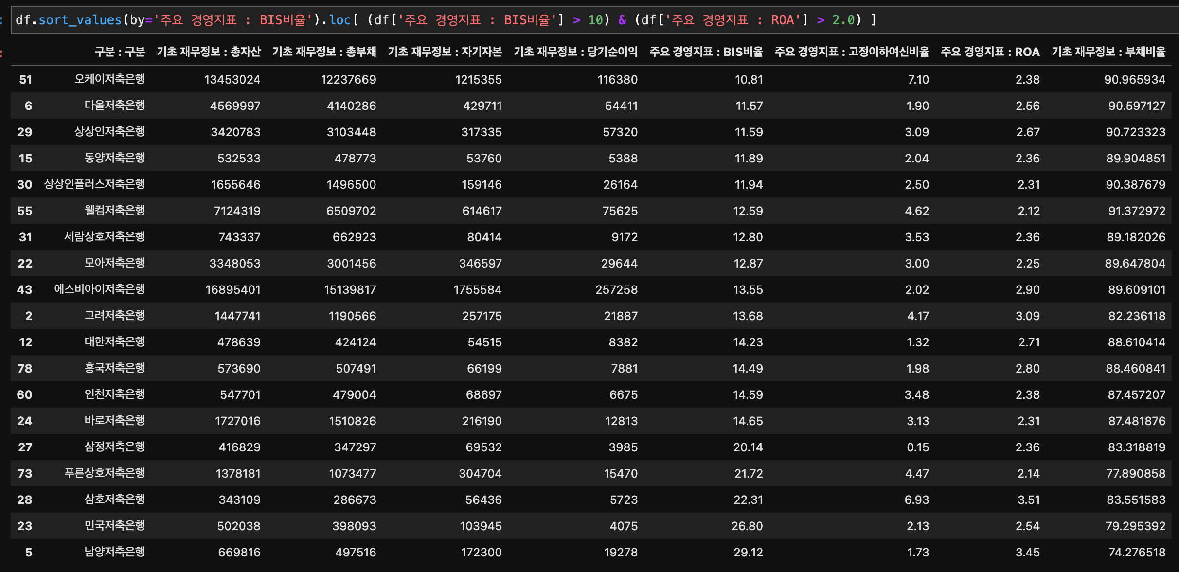 BIS 비율이 10%가 넘고, ROA가 2.0 %가 넘는 회사들을 간추려보면, 다음과 같다.