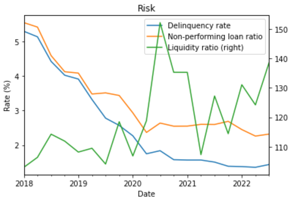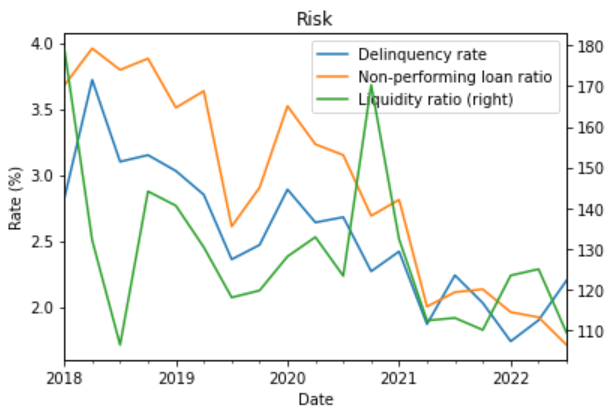 - 해당 비율이 높을수록 부실자산이 많은 금융사로 분류된다. 현재까진 금융사의 고정이하여신비율이 위험수준이 아니지만, 금리 인상 기조에 따라 추후 요주의여신이 고정이하여신으로 격하될 가능성도 높다.